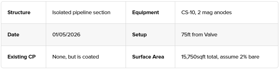Current Density Calculation: Divide current by estimated exposed area (e.g., if 0.15 amps protects 315 ft², density is 0.5 mA/ft²—indicating good coating).