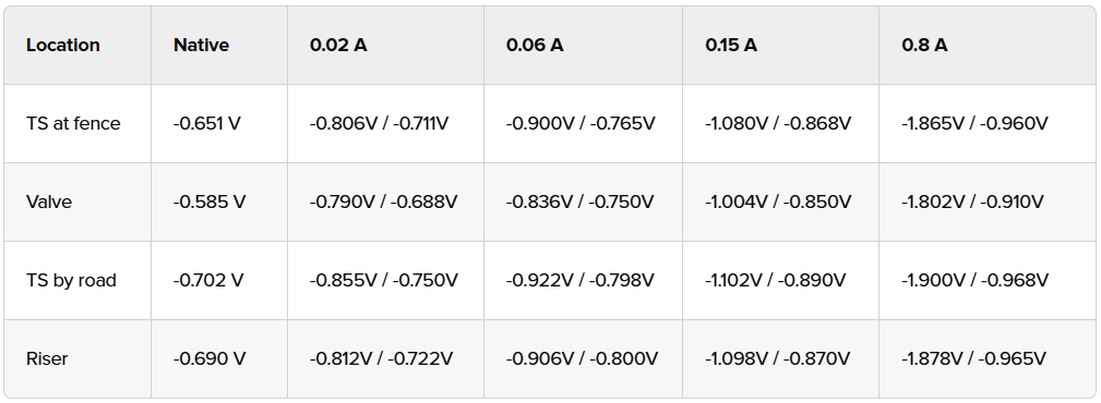 Minimum Current Requirement: The lowest amperage yielding -850 mV instant off at the lowest test point measurement.